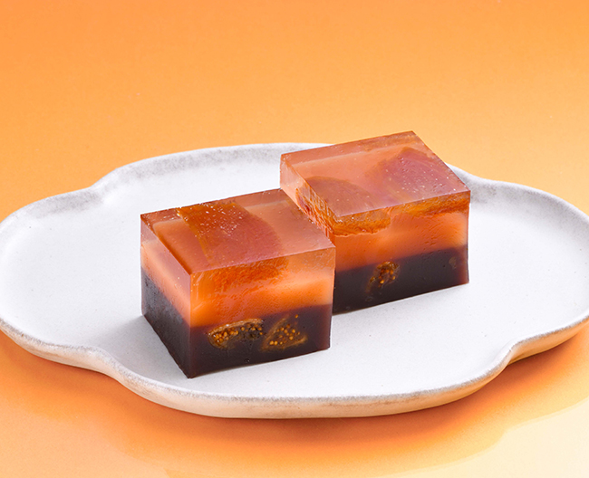 無花果と柿の果肉を琥珀羹や小豆羹にふんだんに散らした、果実味あふれる細工羊羹です。