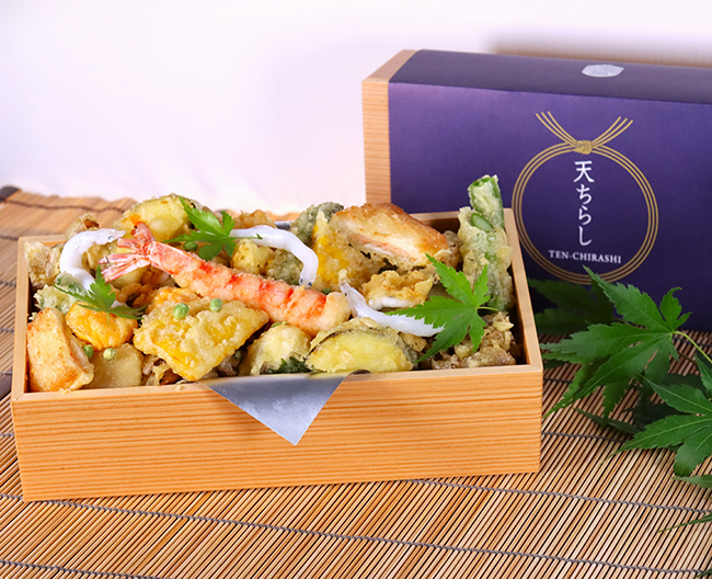 圓堂の天ぷらコース11品もの人気ネタを小さくし、折りの上にちりばめました。
