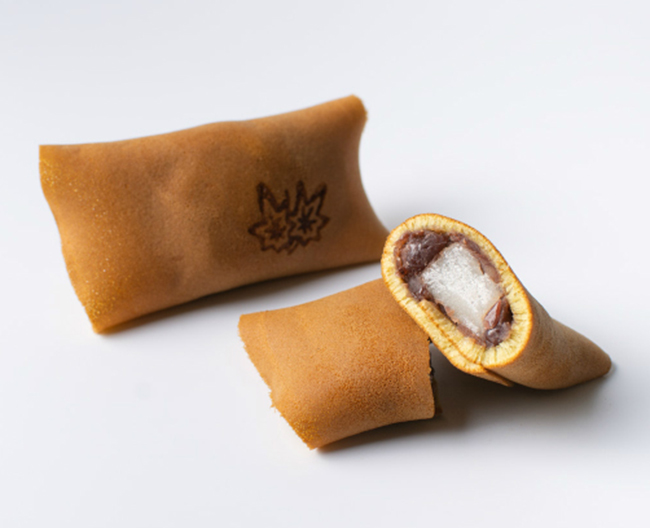 粒あんと求肥を調布生地で巻いて、紅葉の焼印を押しました。