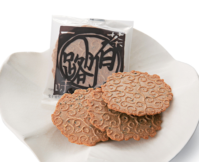 京都・白川の流れに沈む白川砂を「金ごま」「黒ごま」で表し、唐草文様を川面の波紋に見立てた軽い食感のおせんべいです。