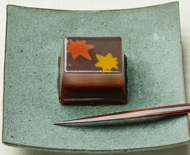 色づく秋をあしらった吉野葛を使用したなめらかな食感の二層羊羹です。