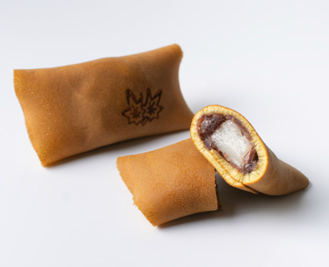 粒あんと求肥を調布生地で巻いて、紅葉の焼印を押しました。