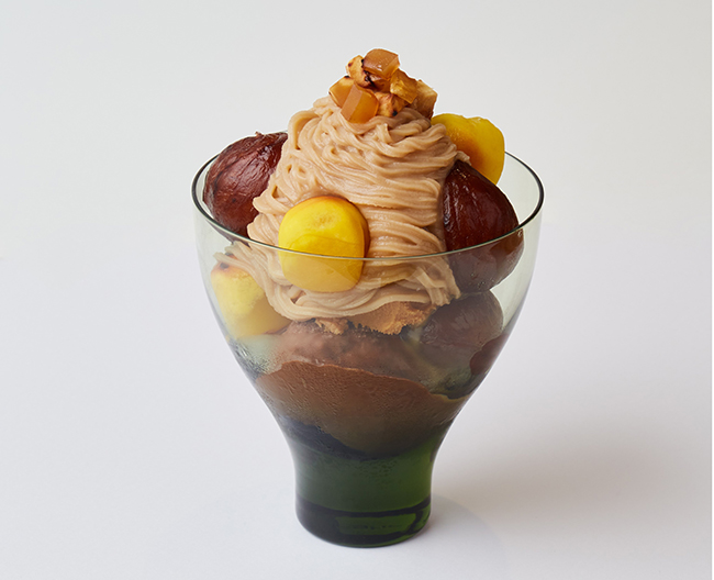 中には栗アイス、アマゾンカカオを使用した濃厚なカカオアイス、オレンジピールが入っています。そこにブランデーを効かせた栗ペーストをたっぷり絞り、栗渋皮煮、栗甘露煮を盛り付けた秋にぴったりの栗づくしのパフェ。