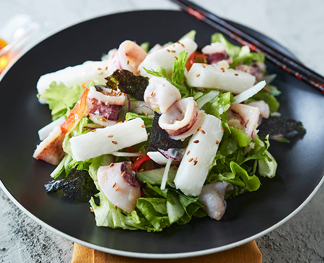 イカのサラダに長芋、韓国のりを合わせ、コチュジャンドレッシングで味わう韓国風のサラダ。