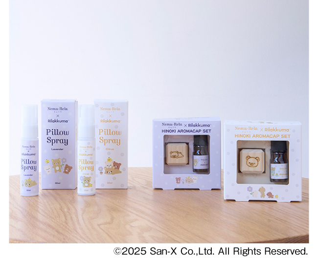 天然アロマが香るフレグランスシリーズ「ネムリラ」を、より多くの睡眠環境に悩みを持つ方に取り入れていただき、自然のもので健やかに楽しい暮らしを過ごしていただきたい。そんな想いから、「ネムリラ」と相性抜群な、いつもごゆるりとマイペースな大人気キャラクター「リラックマ」とのコラボレーションが実現しました。