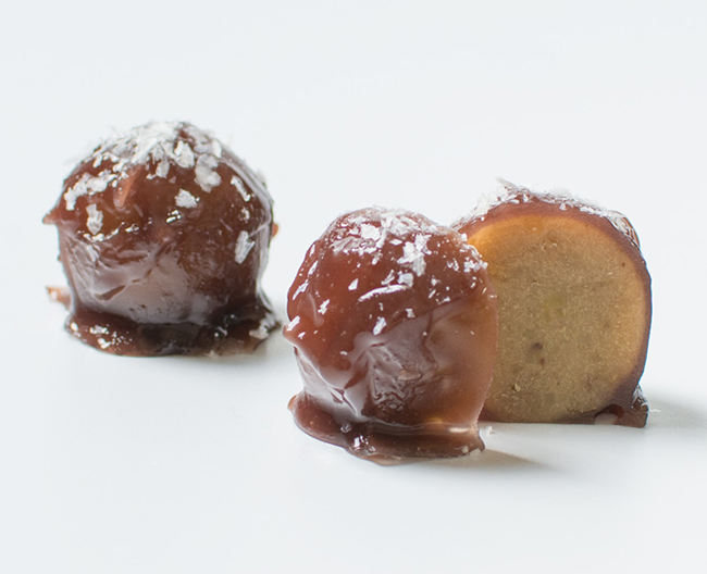 刻み栗入り栗あんを丸めて羊羹をかけた和菓子のトリュフです。