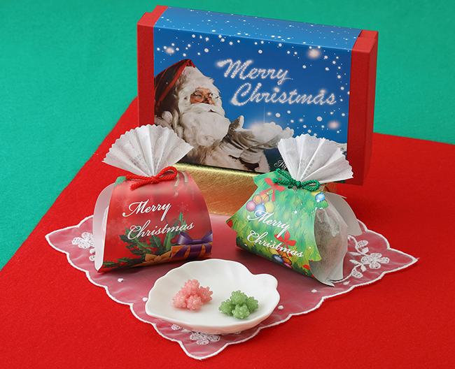 雪の結晶にも見える星形の金平糖。ジューシーな味わいが人気の「苺の金平糖」と完熟メロンをふんだんに使った「めろんの金平糖」の色合いでクリスマスを表現しました。