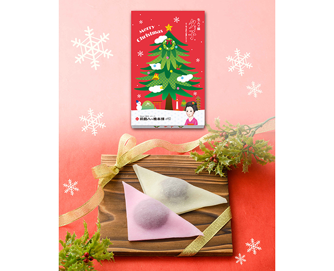 ほどよい酸味の苺の果肉を白あんとあわせ、桃色の生八ッ橋で包んだ「夕子苺」と口どけのよい「チョコレート」を生八ッ橋で包んだ2種類の夕子をクリスマス限定パッケージで仕上げました。