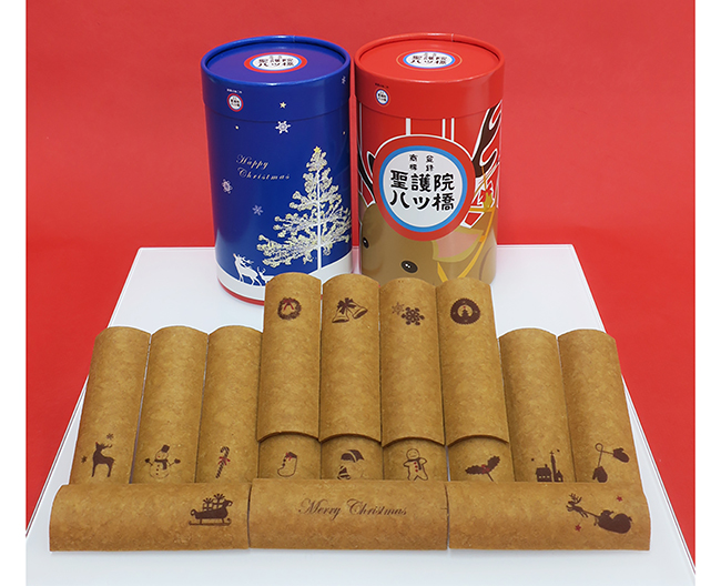3種類のデザイン(ブーツ、帽子、クリスマスツリー)をプリントしたデザインのプレミアム千寿せんべいを期間限定パッケージでご用意しました。