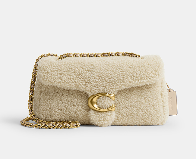 上質なシアリングのディテールが魅力の “タビー”。手触りのよい柔らかなナチュラルシープスキンがリッチさをプラス。今シーズンのムード漂う佇まいに。長めのチェーン ストラップは2重に短くしてドレッシーなスタイルでもお使いいただけます。