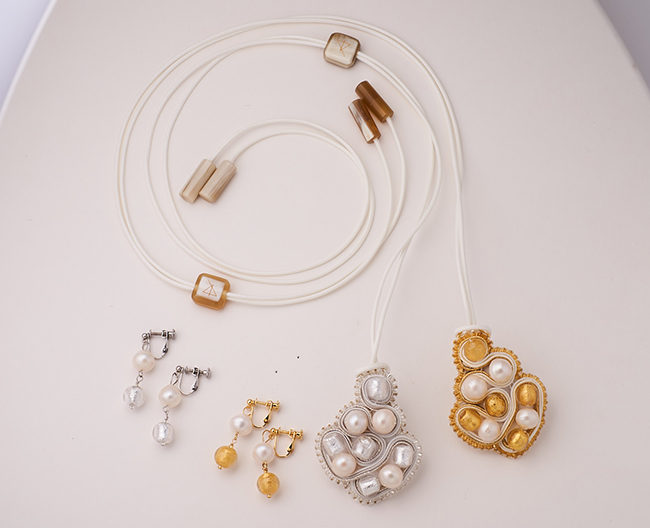 淡水パールや箔入りベネチアンガラスを手作業による伝統的な刺しゅう技法「ソウタシエ」でネックレス&ブローチに。華やかなデザインは、クリスマスにぴったり!