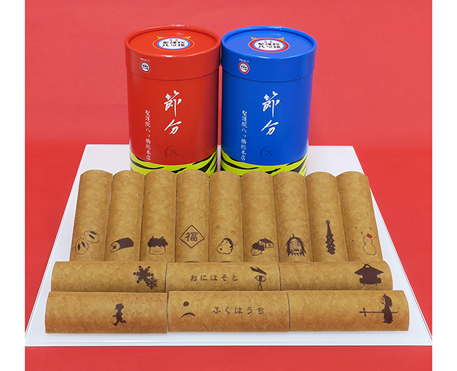 八ッ橋に節分をイメージしたデザインを型刷りしました。