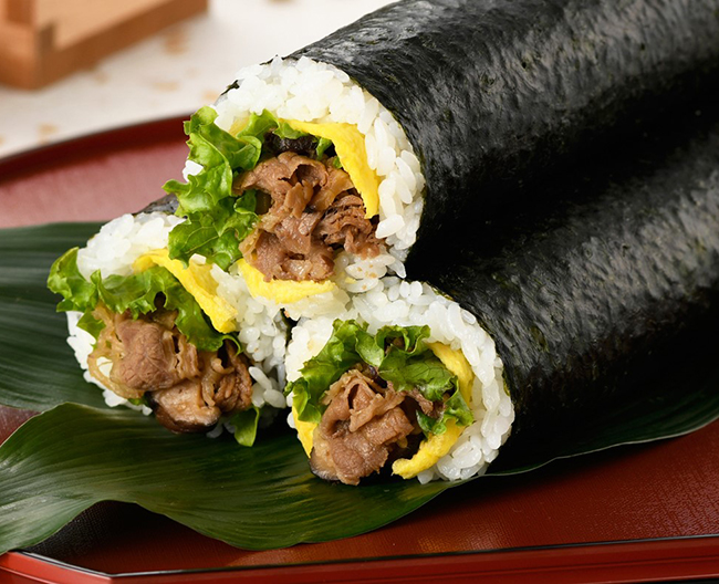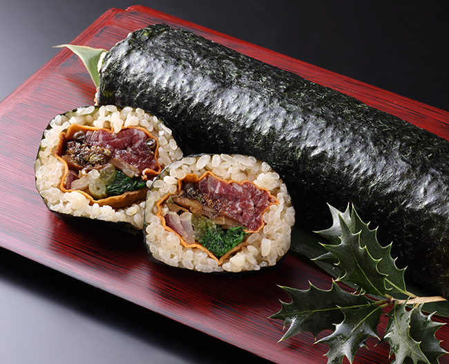 まつおか人気の国産牛のしぐれ煮にしいたけの旨味を加えて恵方巻にしました。