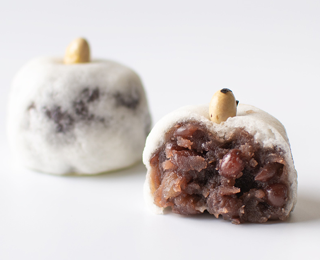 酒かす入りの生地で粒あんを包んだ田舎まんぢうに豆を突き刺して鬼の角にみたてました。