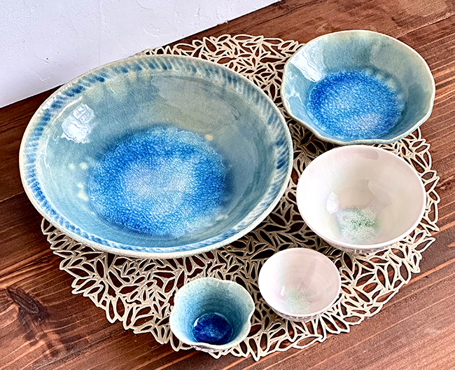 主に琉瀧釉、ガラス釉、朝鮮唐津釉を使い自然を映したような風合いが特徴です。