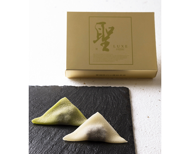 ニッキと抹茶の生八ッ橋に、大納言小豆を使用して丁寧に炊きあげた餡を包みました。