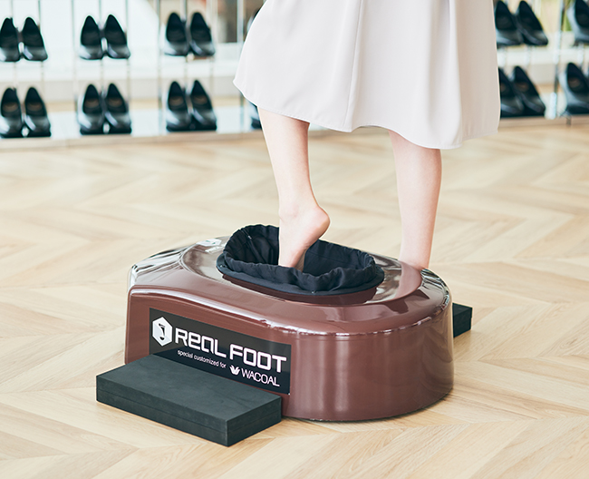 〈ワコール/サクセスウォーク〉では、かかとの丸みを判定することができるワコールオリジナル足型自動計測機を使い、片足約15秒でお客様の足を計測。