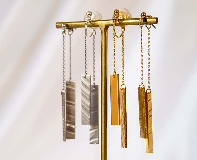 割れてしまったドラムのシンバルや弦楽器の廃材を再利用し、デザインのみならずその音色までも楽しめるユニセックスジュエリーです。