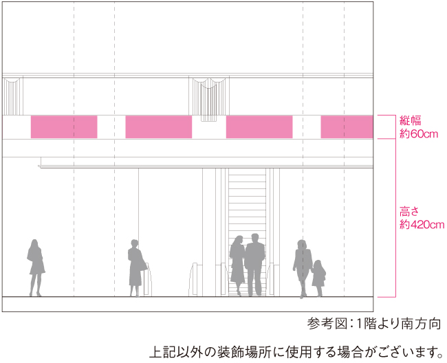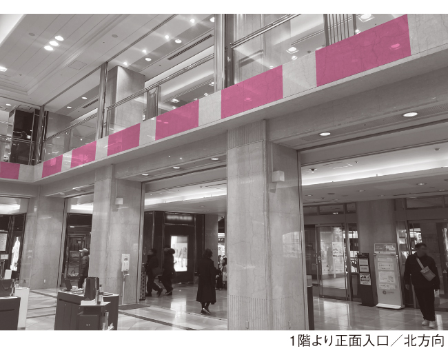 【装飾場所】京都高島屋 正面入口吹き抜け 2階床部側面(床端部化粧面)などを予定しています。なお該当場所表面は大理石の磨き仕上げです。 また他の装飾場所として、各フロアエスカレーターなどの天井部や側部、隣接壁面などに使用をさせていただくことがあります。
