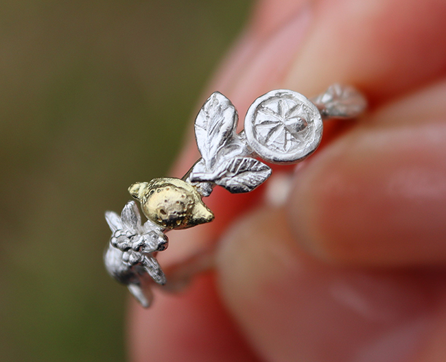 「from seed to fruit-種から実へ-」をコンセプトとして“実”をつける身近な植物や食物が、種から実になる過程をモチーフとしたジュエリーを手仕事で製作。