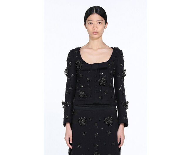 胸元にリボンをあしらったコンパクトなジャケット。フロントと袖には贅沢な手刺しゅうを施しました。華やかながらもネイビーブルーでクリーンな印象に。