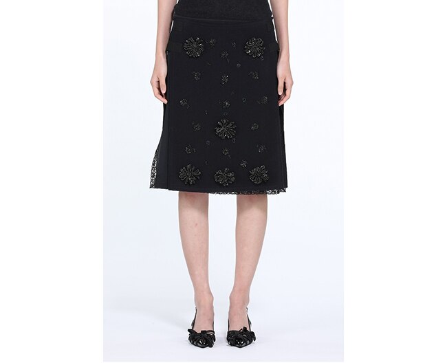 フロントに手刺しゅうを施したリッチなスカートは、サイドのグログランリボンがアクセント。深めのスリットが脚線美を際立たせます。