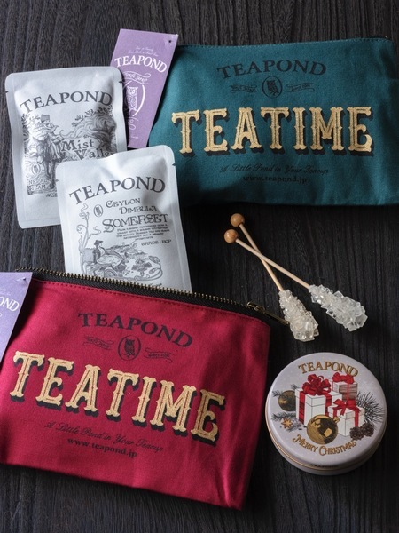 レトロな字体で「TEATIME」とデザインされ、赤や緑のクリスマスカラーのポーチを開けたら、いつでもとっておきのティータイムが始まります。