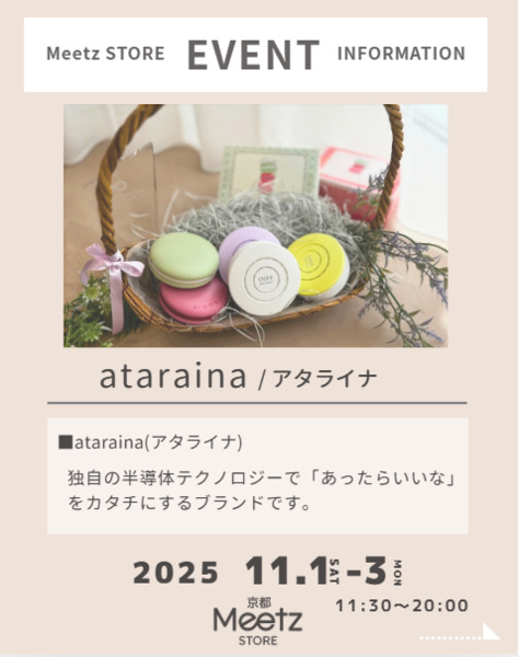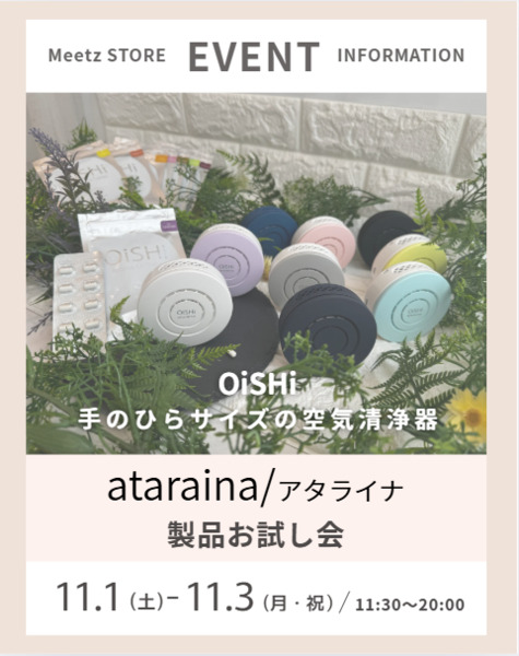Meetz STORE京都店では、ataraina (アタライナ)の各種商品のお試し会を開催致します(*^^*)