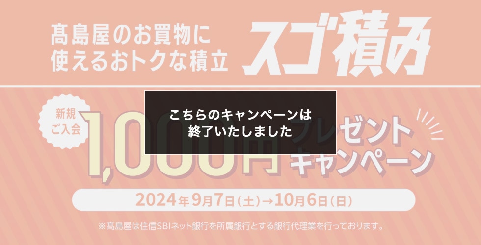 - ・[スゴ積み]への入会は、高島屋ネオバンクアプリをダウンロードしていただき、「住信SBIネット銀行タカシマヤ支店」の口座開設が必要となります。