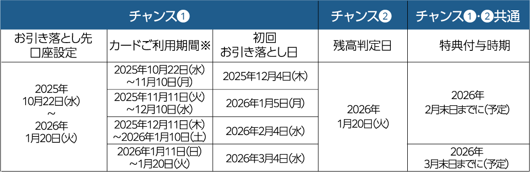 チャンス①、チャンス②において、それぞれの条件をすべて満たしたお客様が特典付与の対象です。