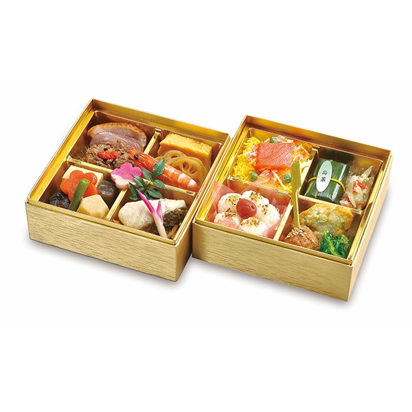 - 金色の華やかな箱に、煮物、焼物、揚物を盛り込んだ2段弁当。3種の御飯とお楽しみいただけます。