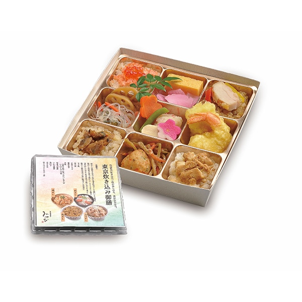 - 鯛飯、鮭飯、深川飯、鶏飯の4種の炊き込みご飯と様々なお料理が入ったお弁当です。