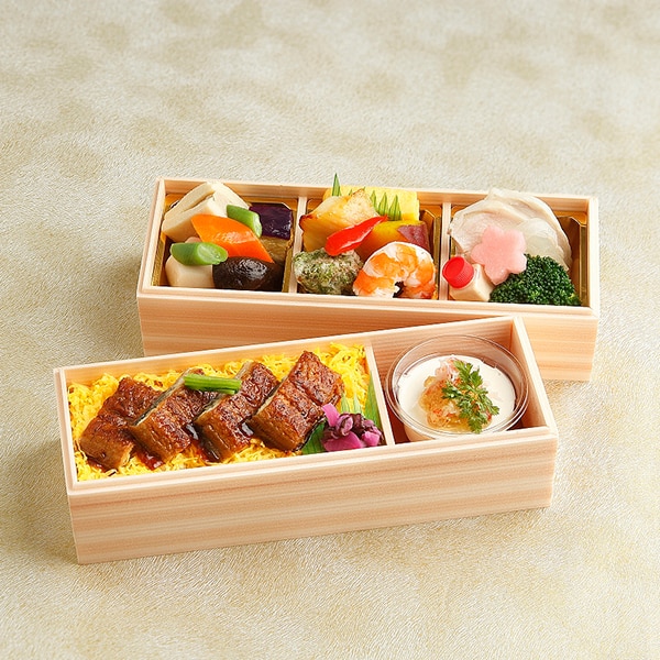 - 二段の折詰弁当。多彩な料理をボリュームたっぷりに詰めました。