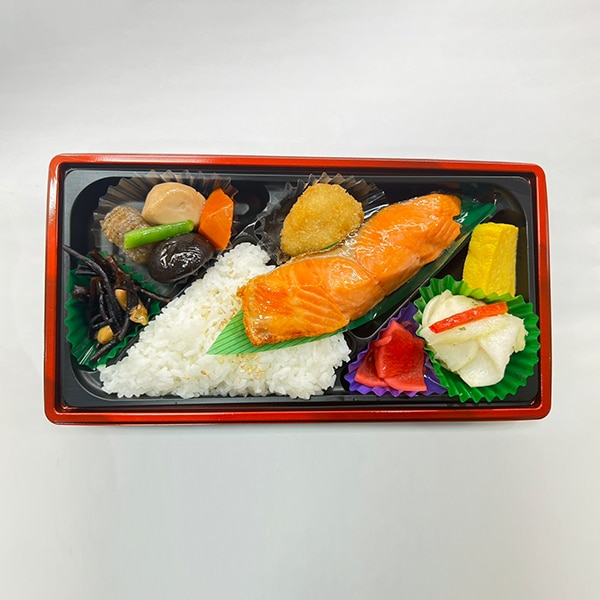 - 藻塩でふっくら焼きあげたサーモンとお惣菜を。
