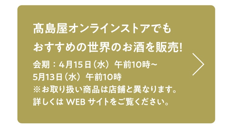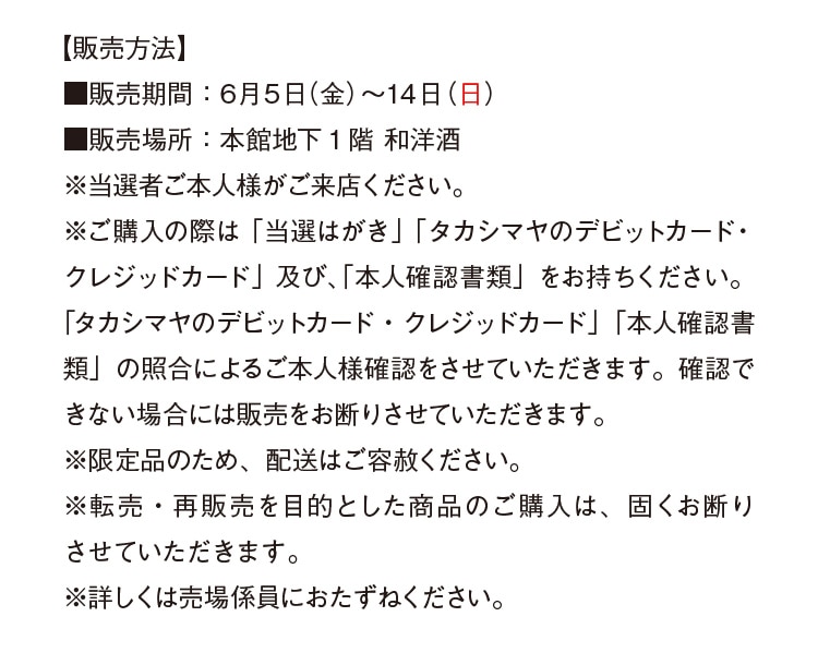 - ※写真・動画の盛り付け、食器はイメージです。※環境負荷軽減のため、ぜひエコバッグをお持ちください。※品数に限りがございますので、売切れの節はご容赦ください。※価格表示のない小物はコーディネート用です。※商品の色は写真と異なる場合がございます。※価格は消費税を含む総額にて表示しております。※価格は2026年4月2日時点のものです。※都合により、生産中止、または仕様・発売日・価格が変更になる場合がございます。※20歳未満の方の飲酒は法律で禁じられております。※妊娠中や授乳期の飲酒は胎児・乳児の発育に悪影響を与えるおそれがあります。【酒類販売管理者標識(2026年4月現在)】販売場の名称及び所在地:㈱髙島屋 日本橋店 東京都中央区日本橋2-4-1、酒類販売管理者の氏名:高玉温子、酒類販売管理研修受講年月日:令和6年1月23日、次回研修の受講期限:令和9年1月22日、研修実施団体名:東京小売酒販組合