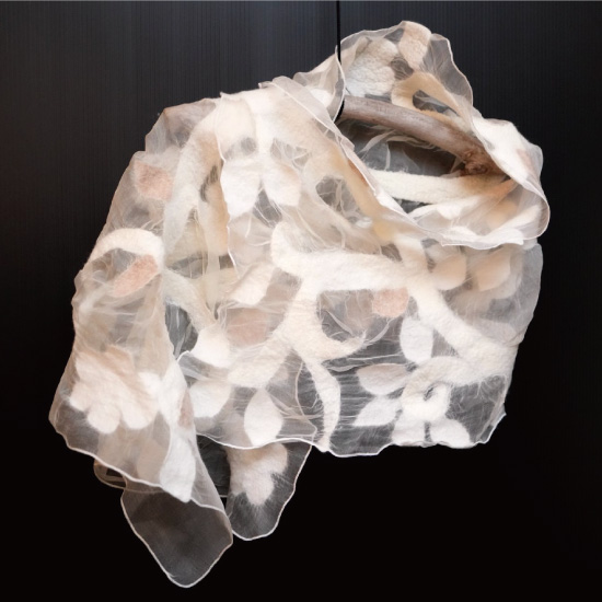 絹と羊毛などの天然繊維を使用、羊毛の縮む性質をいかした技法で製作。軽く、シワも気にならず、一年中ご利用いただけます。