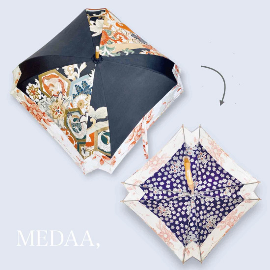 リユースきものを活用した、職人手づくりの四角い日傘。内側と外側にそれぞれ異なる生地を使用した二重仕立てです。