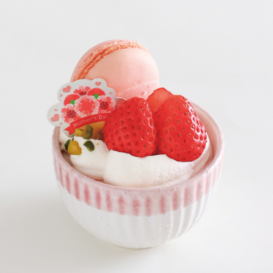 ジューシーな苺のムースに、人気のマカロンを丸ごと飾った、母の日のカップデザート。