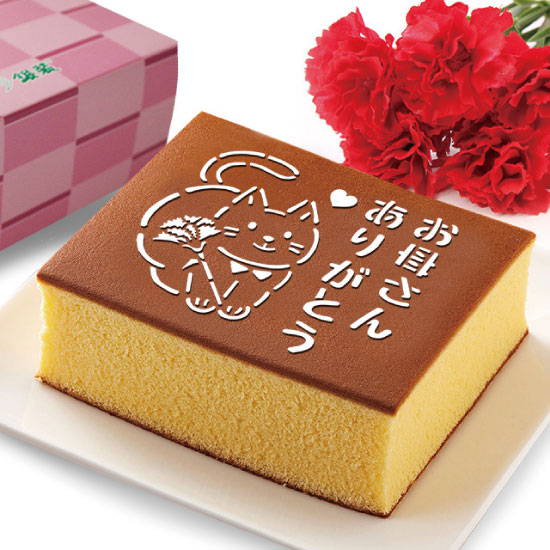 カーネーションを持った可愛いネコが感謝の気持ちを届けます。職人が丁寧に焼きあげデコレーションした母の日のカステラです。