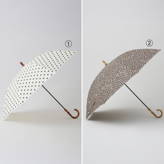 手元にバンブーを使用してクラシカルな、折り畳み式の晴雨兼用傘。爽やかなドット柄や遊び心のあるレオパード柄などをご用意。