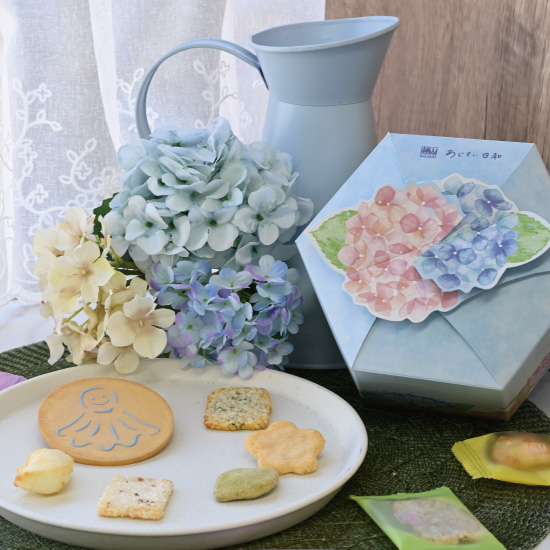 梅ざらめやゆず醤油など、爽やかな味わいのひとくちあられの詰め合わせ。あじさいの花をあしらった六角形の小箱入りです。