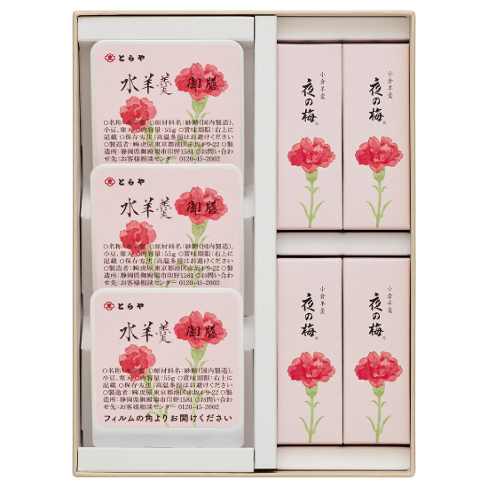 カーネーションを配した、華やかな装い。母の日パッケージ小形羊羹『夜の梅』4点と、母の日パッケージ水羊羹「御膳(こし餡)」3点を詰め合わせました。