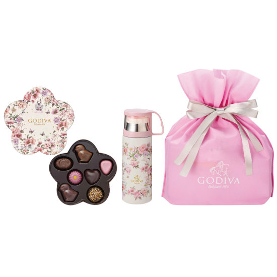 春らしい色とりどりの花を表現したフラワー形のパッケージに心躍るチョコレートの詰め合わせと、オリジナルデザインのステンレスボトルをセット。