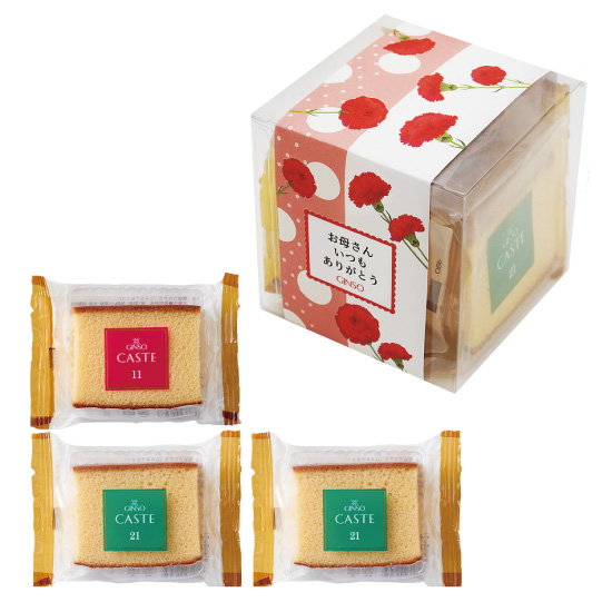 個装カステラが3個入ったキューブタイプのプチギフト。赤いカーネーションと感謝のメッセージをデザインした母の日限定パッケージ。