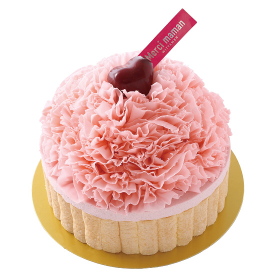 苺シロップをスポンジに染み込ませたショートケーキ。苺クリームを絞り、苺やチョコなどでブーケに見立てた母の日限定の贈りものです。