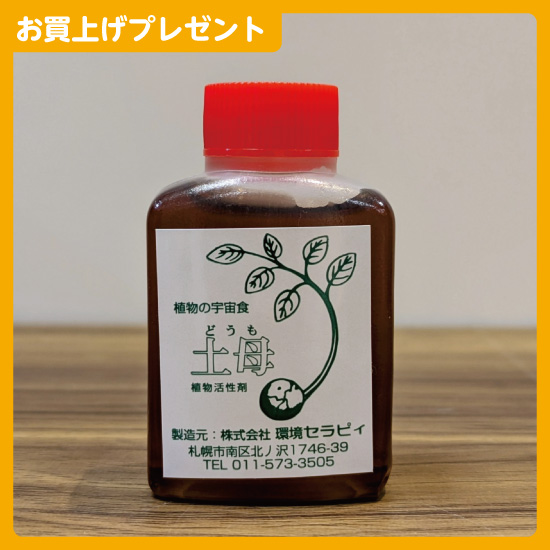 税込5,500円以上観葉植物・園芸用品をお買上げのお客様に、植物用液体活力剤「土母(どうも)」(約33ml・1本)をプレゼントいたします。