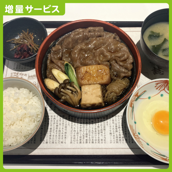 人形町今半イートインにて「すき焼御膳 松」ご注文のお客様に、肉増量(80g→120g)にて販売いたします。