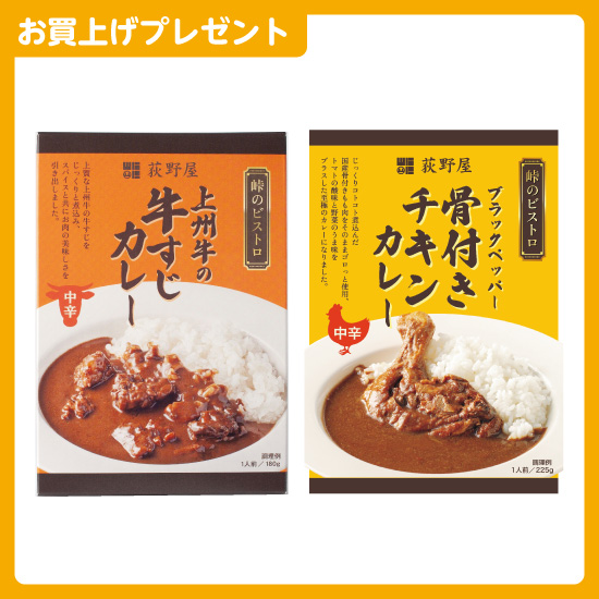 峠のビストロ 上州牛の牛すじカレーか峠のビストロ ブラックペッパー骨付きチキンカレーのどちらか1つをプレゼントいたします。※セール品は対象外