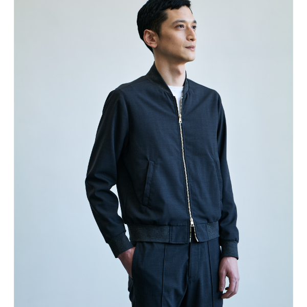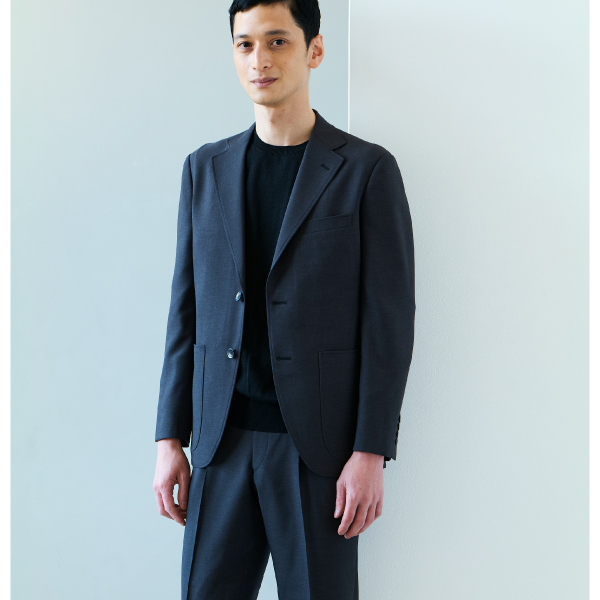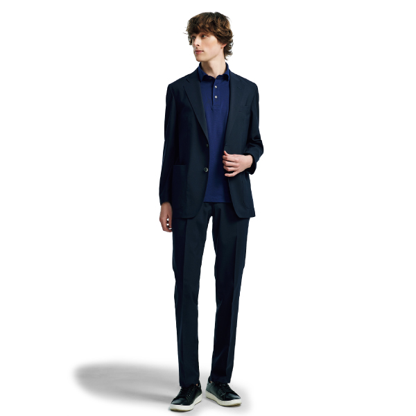 ポリエステル50%(うちRENU®20%)を使用した、スタイリッシュな春夏のセットアップに。上質なウールの風合いを活かしながら涼しさと防シワ性をプラス。