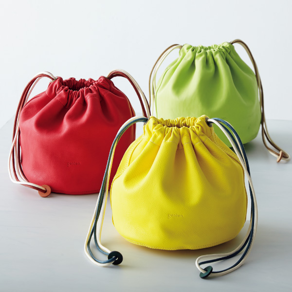 シミや傷のある革を、天然素材の魅力として余すことなく製品化。環境に配慮したクロムフリーなめしでフルーツカラーを表現した巾着バッグです。